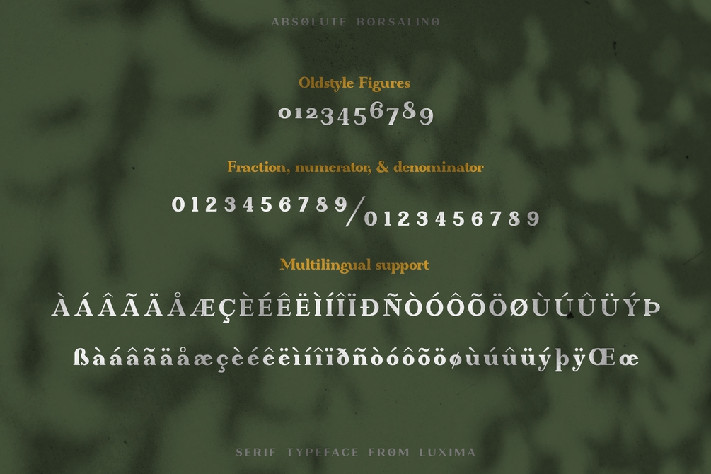 Absolute Borsalino full version consists of uppercase, lowercase, digits, punctuation marks, multilingual letters, and 9 stylistic sets/character alternatives. Total 598 characters.
