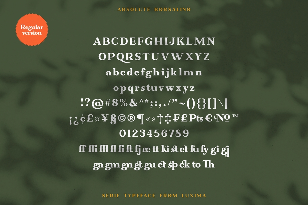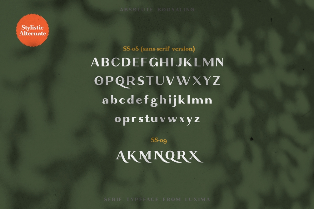 Absolute Borsalino a modern serif font with unique variation. From this product you will get 9 uppercase and 3 lowercase stylistic set of Absolute Borsalino typeface. Includes sans serif version! yes just for you. One file, multiple benefit.