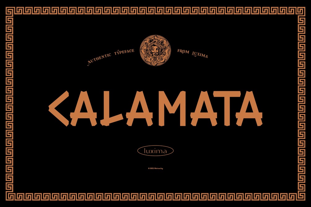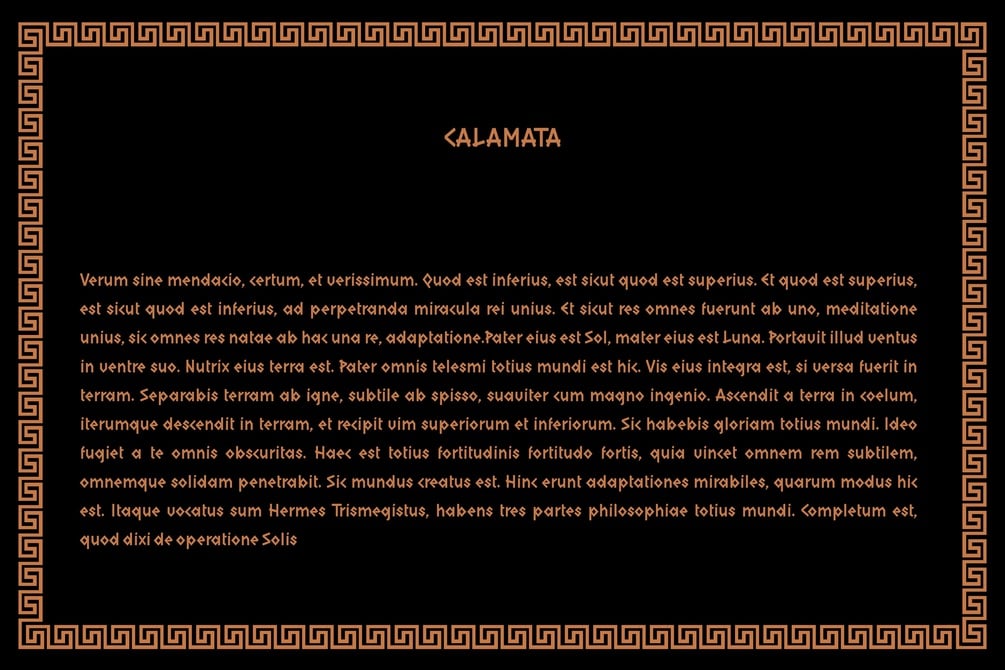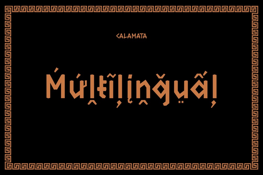 Calamata is a decorative, serif font with 683 glyphs in 2 weights (Bold and regular) including: